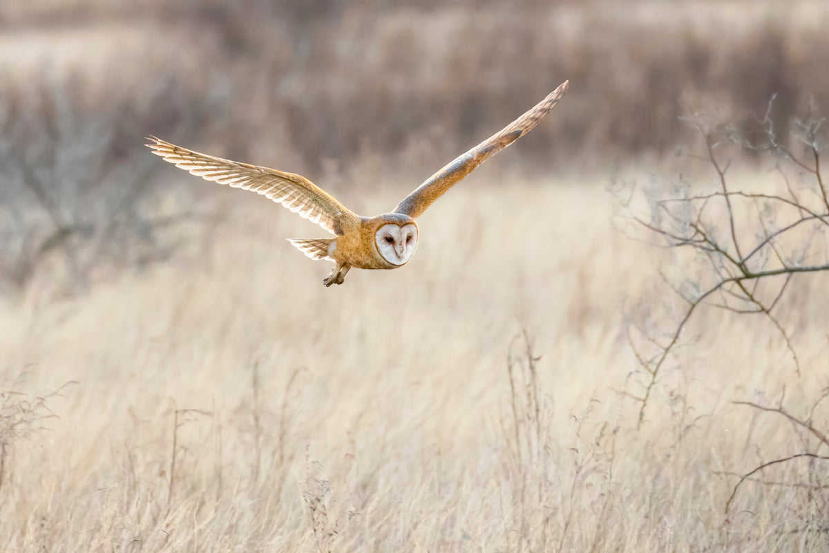 It was an amazing experience to watch this Barn Owl hunt in daylight. Usually nocturnal, this owl was provided a stunning show as it hunted over a field as the sun set. Barn Owls have great low-light vision, and some of the best hearing in the entire animal word. Their hearing is so sensitive, that they can listen to their rodent prey moving around deep underground. However, their prey will never hear them coming, as they have specialized feathers that enable them to fly completely silently.