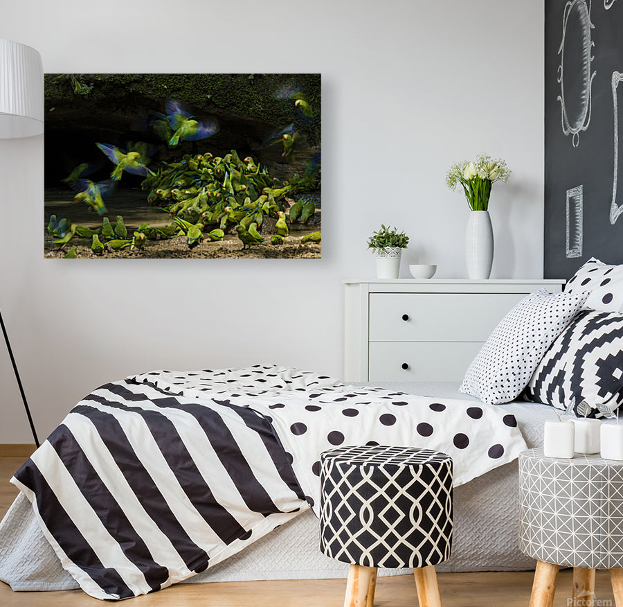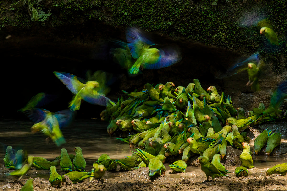 After spending 3 days waiting in a hide deep in the Ecuadorian Amazon, I was rewarded with the breathtaking sight of hundreds of Cobalt-winged Parakeets descending to the forest floor. The parakeets were gathering to drink and eat nutrient-rich water and clay, which they need to neutralize the toxins in acidic fruits that they eat. Being vulnerable on the ground, even the slightest sound or hint of a potential predator would scare the entire flock away, and it could take them hours or even days for them to build up the courage to return. I used a slow shutter speed to capture the motion and colour in the wings of the birds as they flew down to the growing flock of parakeets on the ground.